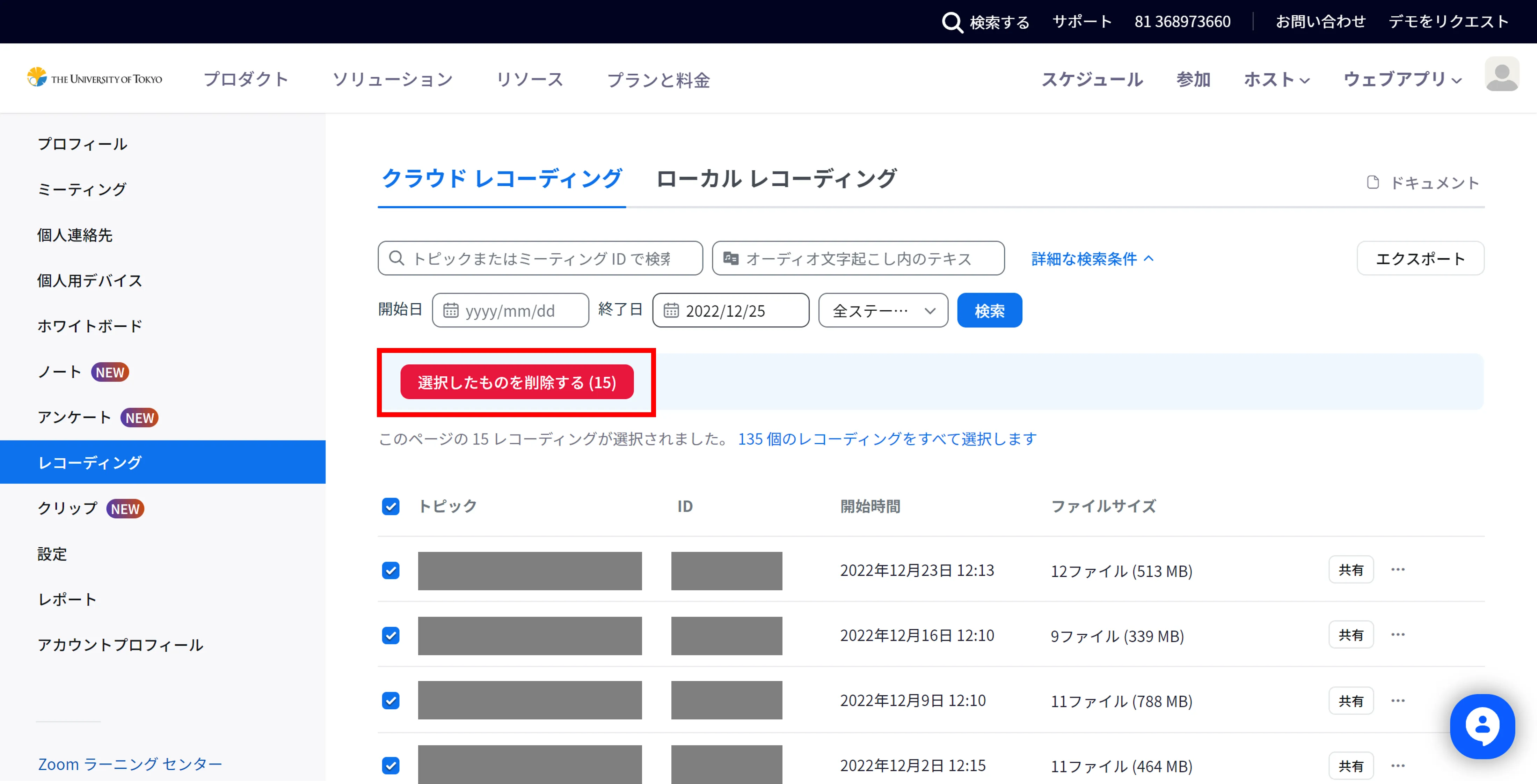 - From the list of cloud recordings, select recordings you wish to delete and check the checkboxes.
