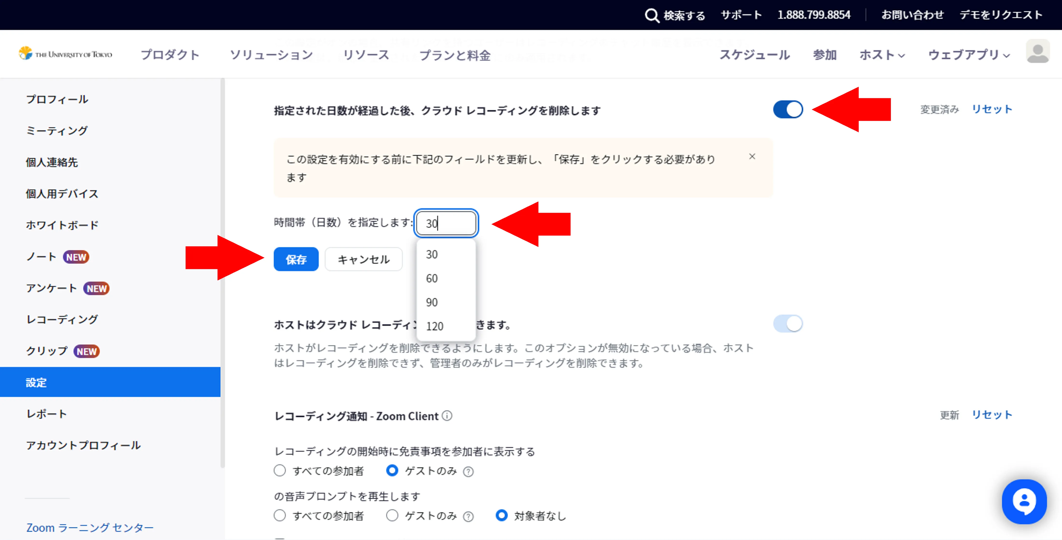 - Find the item titled “Delete cloud recordings after a specified number of days” and select the toggle to enable this setting. Then, a box for specifying the number of days after recording that the data will be automatically deleted will appear; so enter a desired number of days and press “Save”.