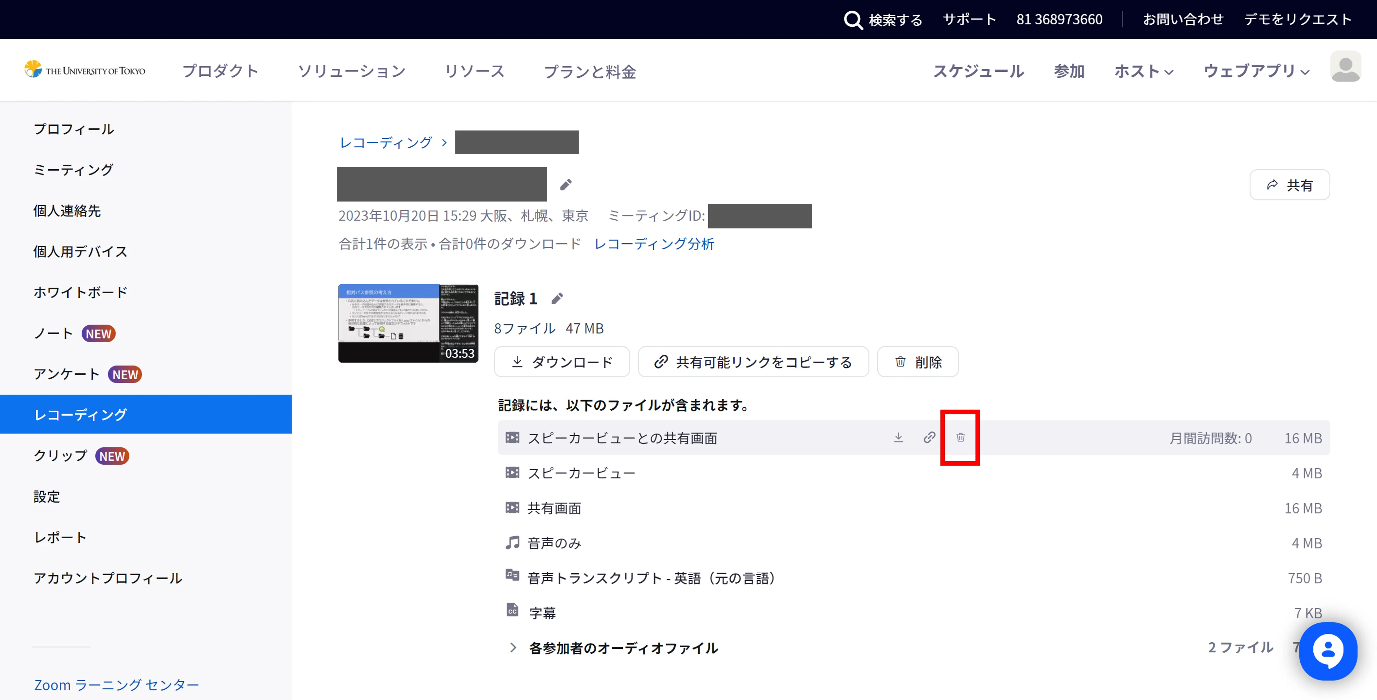 - On the recording detail screen, hover the mouse pointer over the file to be deleted and select the trash icon.