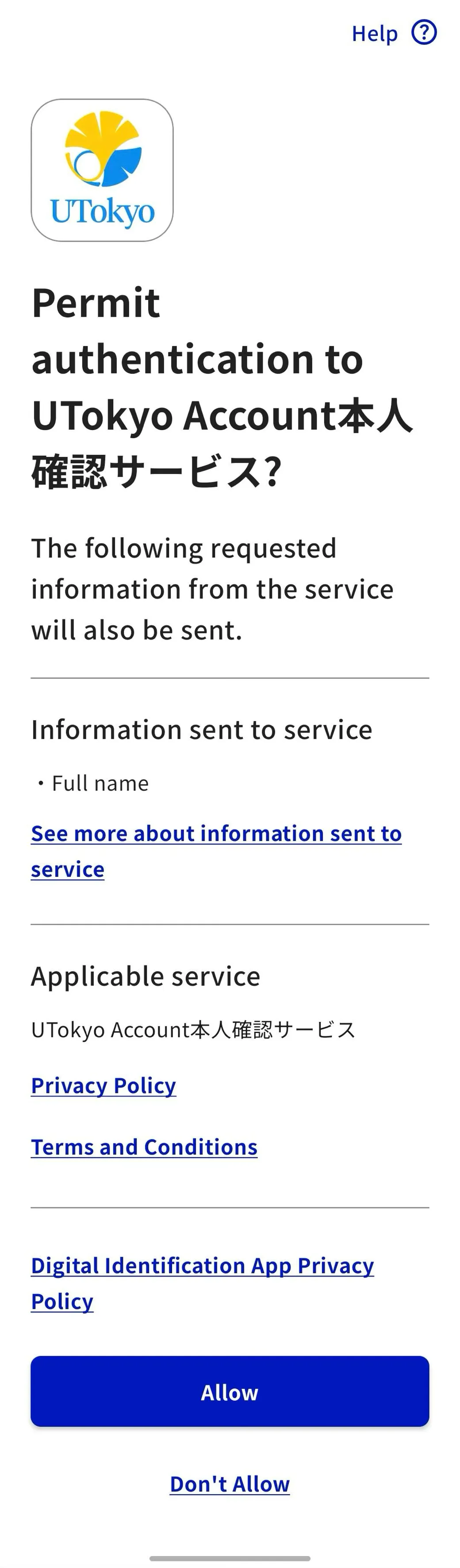 A screen will appear asking for permission to authenticate with the UTokyo Account Identity Verification Service. After reviewing the privacy policy and terms and conditions, tap “Allow”.