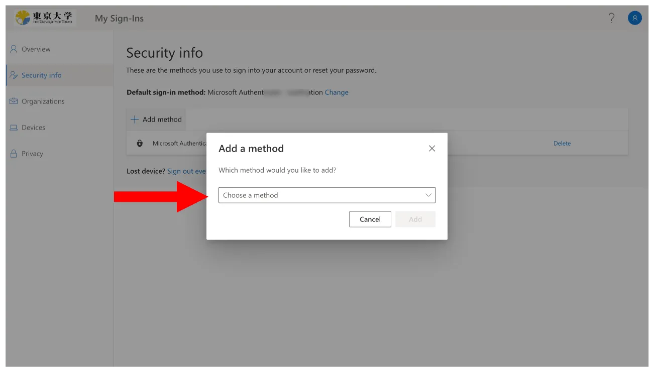 - Click “Add method” in the Security info page.