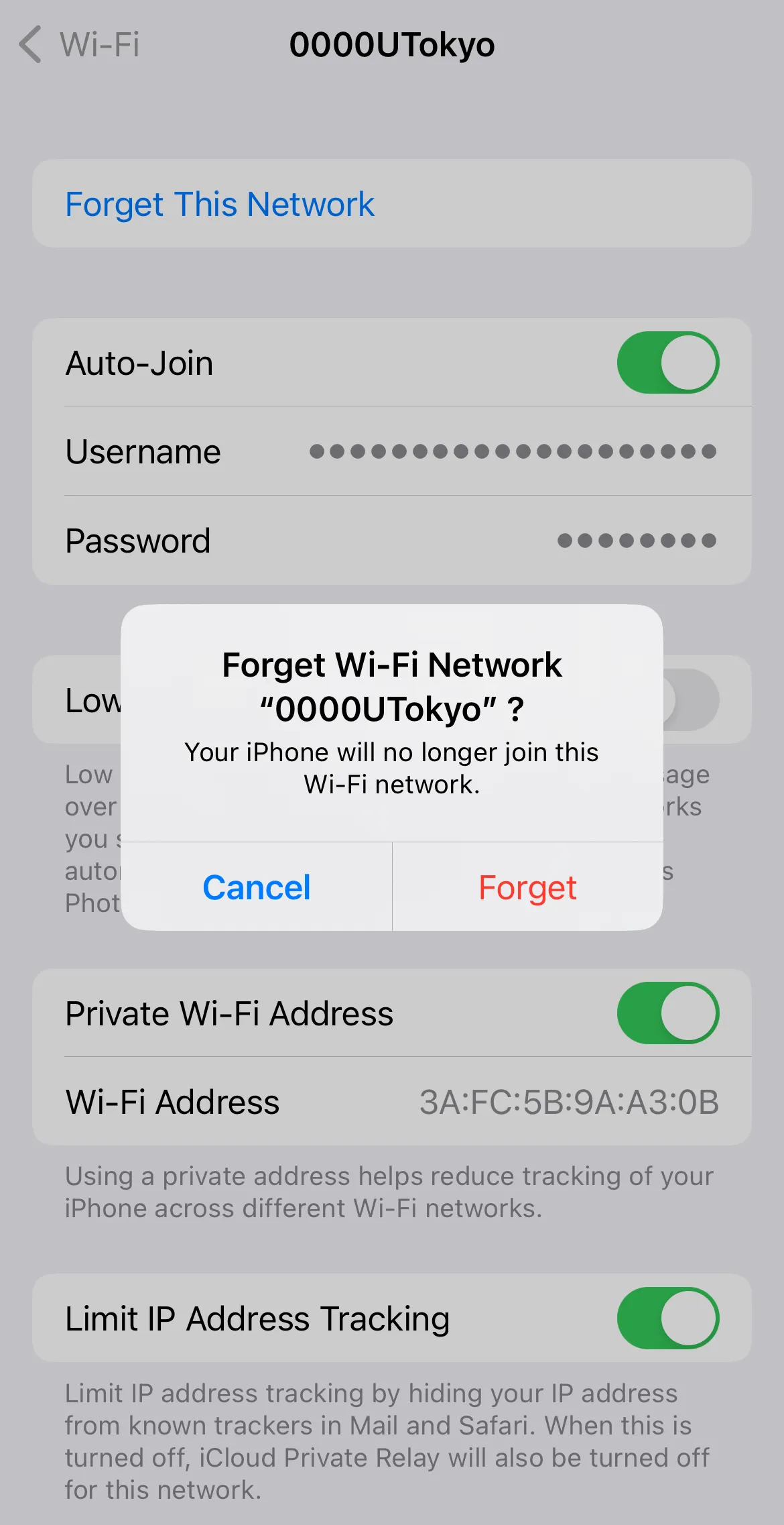 If the screen for entering a user-name and a password does not appear in Step 2 and it fails to connect to the Wi-Fi, you need to delete the existing setting and register a new one. This is necessary because although once you reissue your account and your previous account becomes invalid, your devices may still store it. Before using the new account, your devices must “forget” the previous one. There is no need to worry about never being able to connect to the UTokyo Wi-Fi again upon “deleting” a account.Tap the SSID found in Step 2, select “Forget this Network”. When the screen saying “Forget Wi-Fi network “0000UTokyo”?” comes up, select “Forget”.