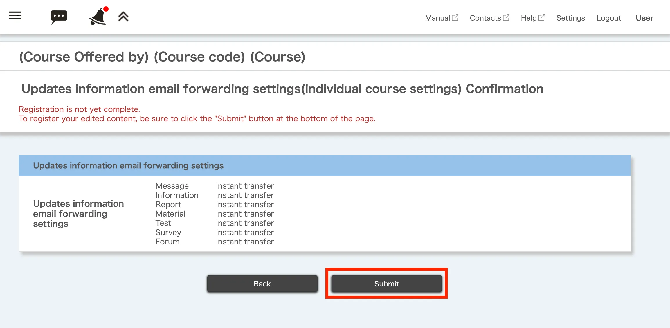 ※1. When forwarding to LINE, the “Instant transfer” of update information for assignments, course materials, quizzes, surveys, and forums are not available. Only the “Redirecting all information once a day” option is available (you can also select “Do not forward”).