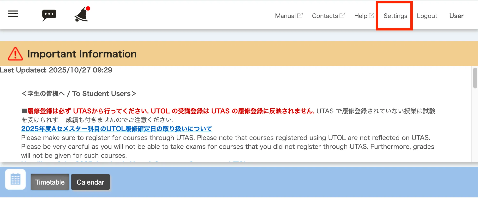 - Click the relevant link under the “Updates information email/LINE/UTokyo Slack forwarding settings” (in blue) at the top right of the screen.