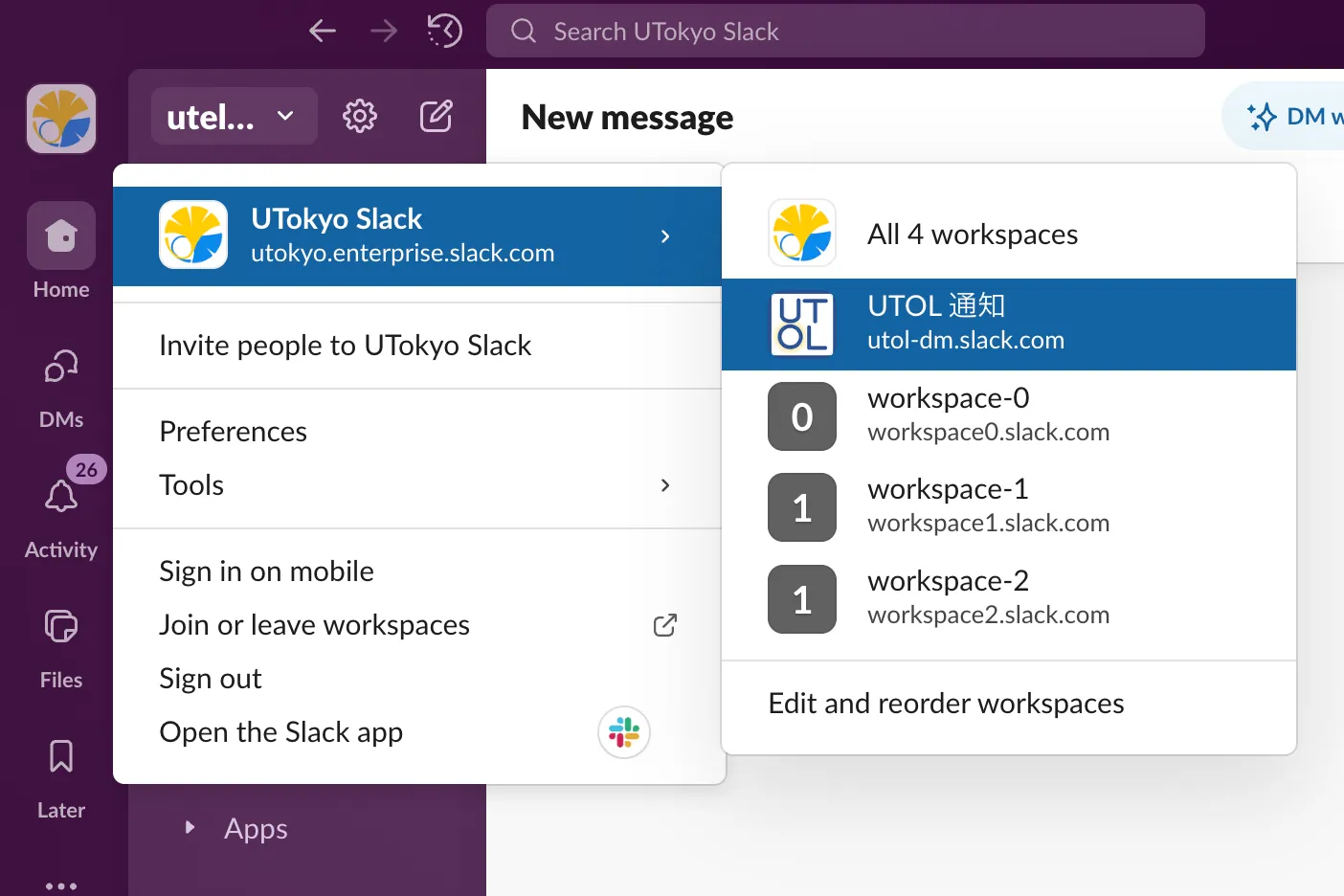- After joining Slack, the workspace screen will appear. Open the drop-down list shows workspace name in the top left and confirm that “UTOL通知” appears in the list of workspaces.