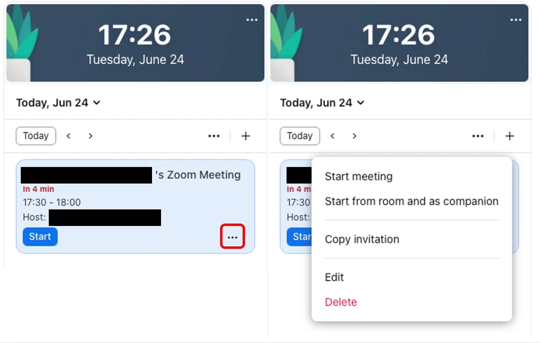 On the day of the meeting, a screen like the image below will appear in the “Home” page. You can copy the invitation link and edit the meeting from “…”.