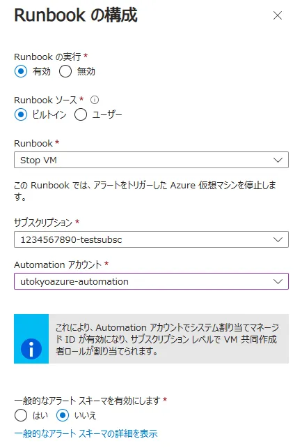 StopVMを選択して下さい. - サブスクリプション:項目が追加されるので,Runbook を作成した Automation アカウントを作成したサブスクリプションを選択してください.