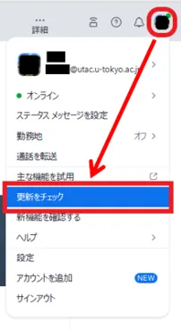 ホーム画面のアイコンから,「更新のチェック」を押してください.すると,最新版かどうかのチェックが始まります.すでに最新版がインストールされている場合「最新の状態を保っています」と表示されます.インストール可能な最新版がある場合は,「新しいバージョンのZoomを利用できます」と表示されます.「今すぐ更新」を押して最新版をインストールしてください.